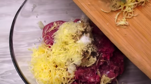 Ser trzemy na tarce z drobnymi oczami i dodajemy go do mięsnego farszu. Całość dokładnie mieszamy i odstawiamy.