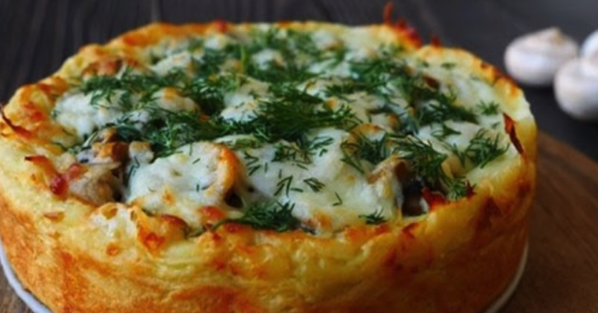 Na blaszce równomiernie rozprowadzamy ciasto ziemniaczane, a pośrodku niego robimy wgłębienie, a w nim układamy mięso i lekko je dociskamy. Grzyby umieszczamy na mięsie z kurczaka. Całość przykrywamy folią i wkładamy do piekarnika na 20 minut w temperaturze 180 stopni. Na grubych okach na tarce ścieramy ser.