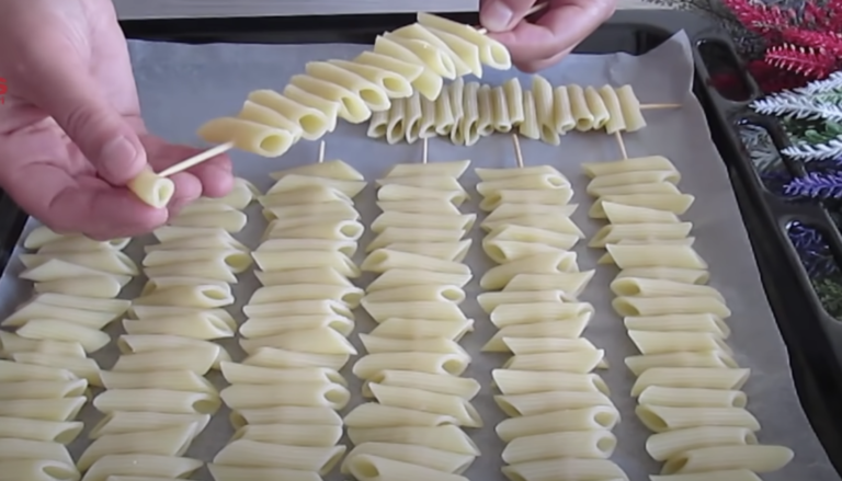 Nietypowy pomysł na makaron – Nie wiem czemu wcześniej na to nie wpadłam – Szaszłyki z makaronu prawie jak pizza.