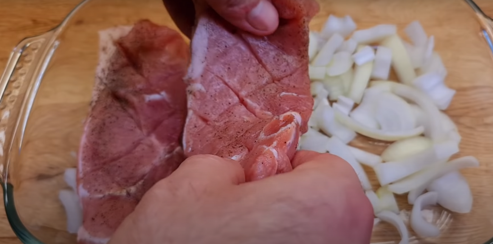 Kawałki mięsa ponacinaj tak, aby na ich powierzchni powstała kratka. Posyp przyprawami. Cebulę obierz i pokrój na nieduże kawałki.