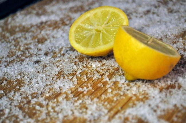 Następnie połówką cytryny przecieramy energicznie powierzchnię deski. Po około 15 min powtarzamy czynność. Na koniec umytą deskę spłukujemy obficie ciepłą wodą.