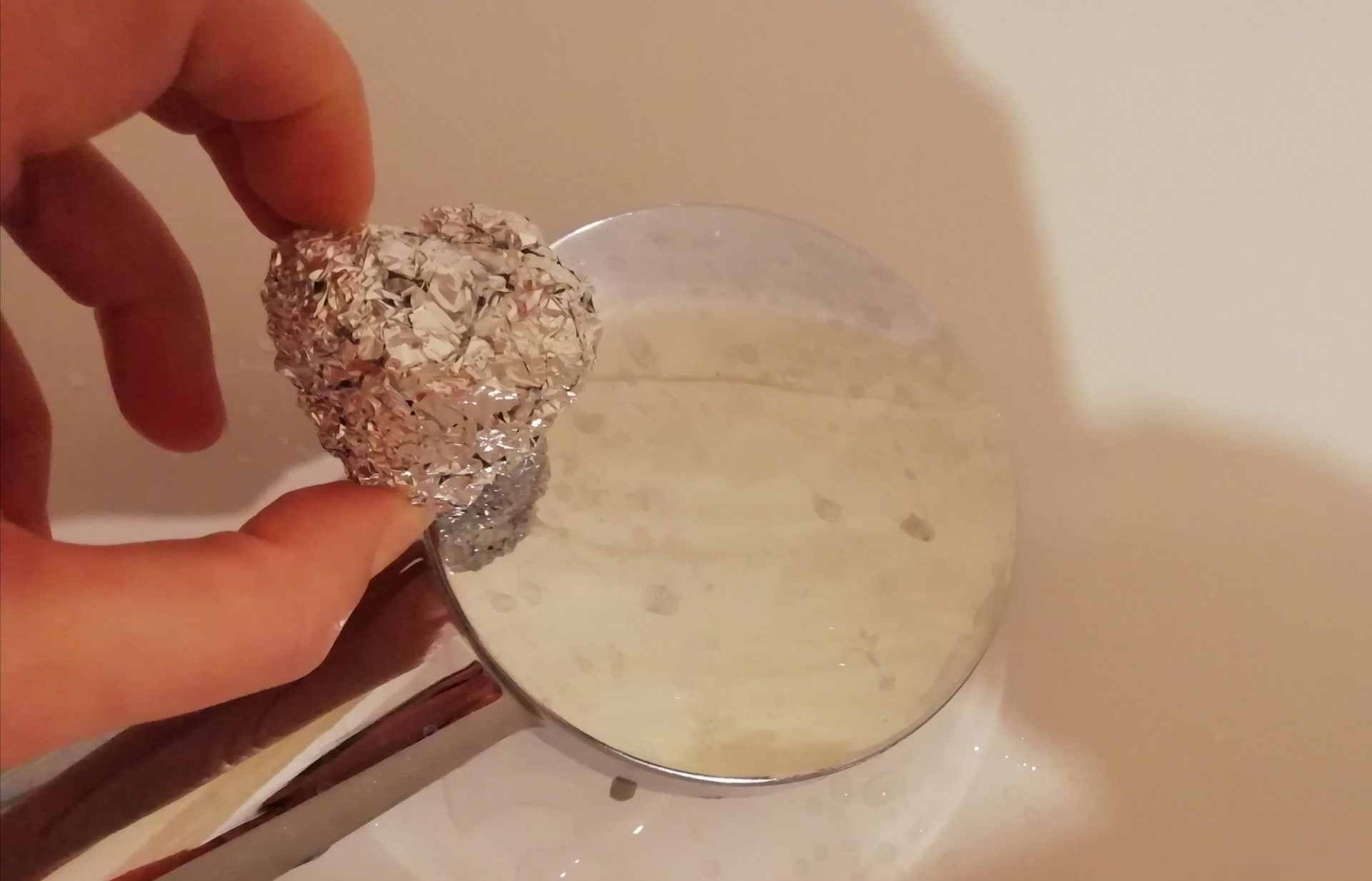 Kulkę z folii aluminiowej zanurz w wodzie i przetrzyj nią powierzchnie zardzewiałe, aby usunąć plamy rdzy. Jak za dotknięciem różdżki czarodziejskiej, rdza znika – zaskoczony będziesz miło. Doskonale nadaje się również do kranów czyszczenia, gdyż kamień usuwa. Uważać jednak należy, aby baterii nie porysować, nie wywierając zbyt dużego nacisku.