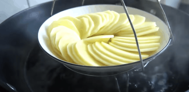 Ziemniaka cienko obierz oraz pokrój w plasterki. Następnie gotuj na parze przez ok.20 minut. Jeśli wolisz możesz go ugotować w wodzie.