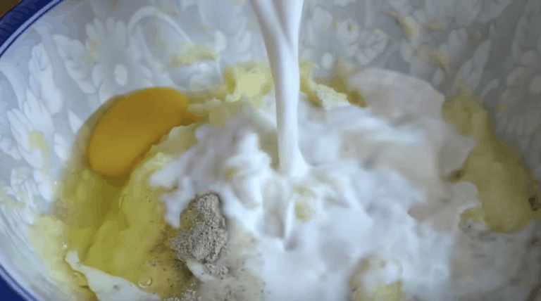 Po ugotowaniu odlej wodę i rozgnieć plasterki na puree. Dodaj drożdże, sól, pieprz, jajko oraz ciepłe mleko. Wymieszaj składniki.