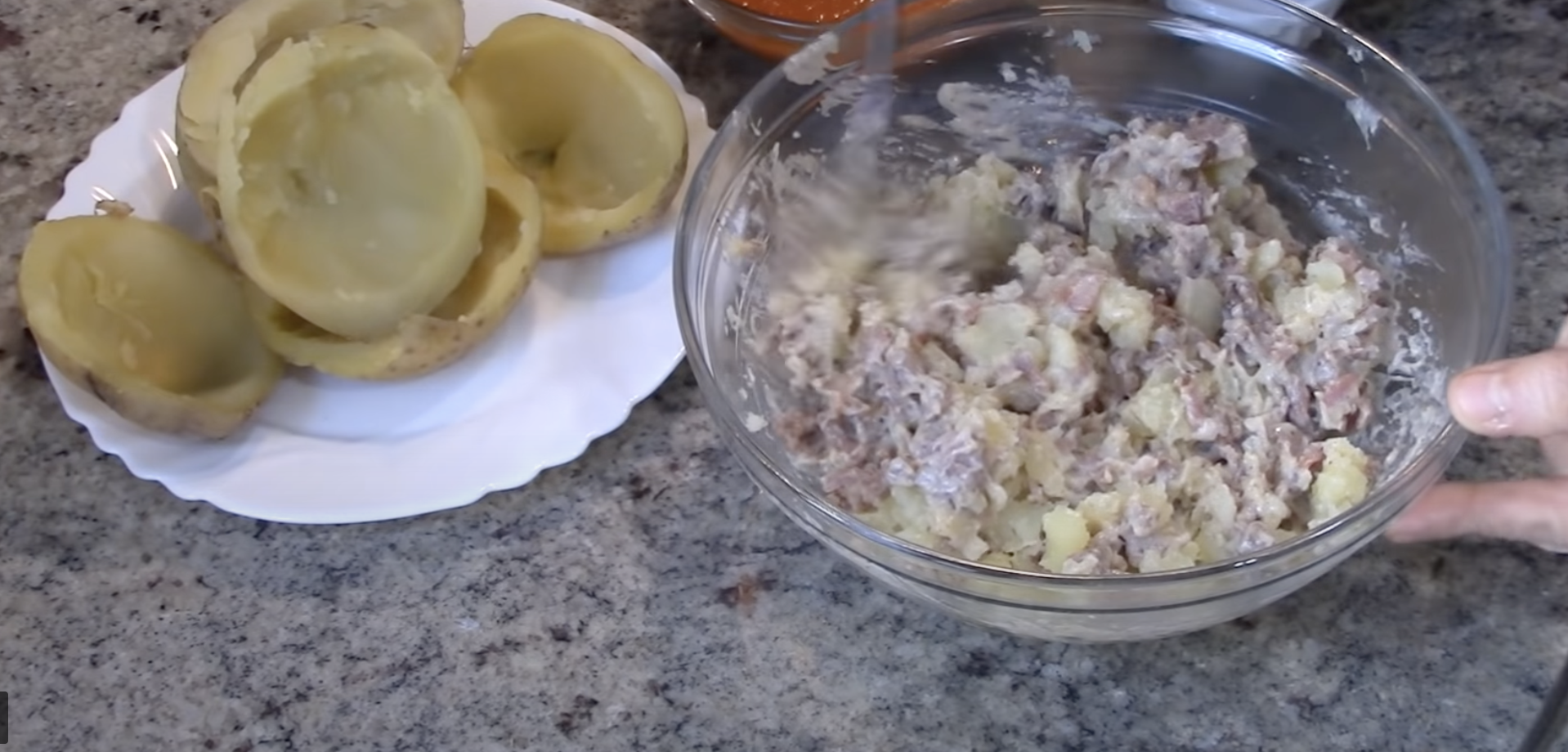 Następnie dodajemy mleko i gotujemy do momentu aż sos zgęstnieje. Do mięsa dodajemy wydrążone fragmenty ziemniaków oraz sos pomidorowy. Całość należy dokładnie wymieszać.