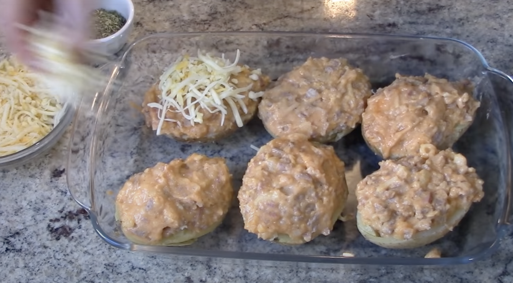Całość delikatnie posolić, dodać starty ser. Tak przygotowanym nadzieniem trzeba wypełnić połówki ziemniaków.