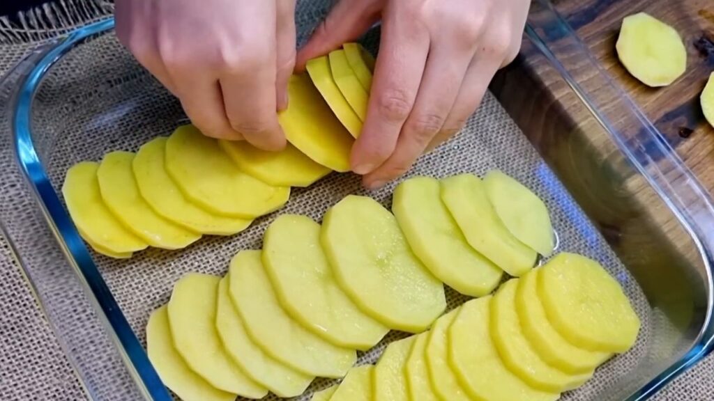 Przygotowanie ziemniaków i kurczaka: Natłuść brytfannę oliwą z oliwek. Ziemniaki pokrój w krążki i ułóż na dnie brytfanny. Dopraw solą i pieprzem. Piersi z kurczaka pokrój na kawałki i rozłóż równomiernie na ziemniakach.