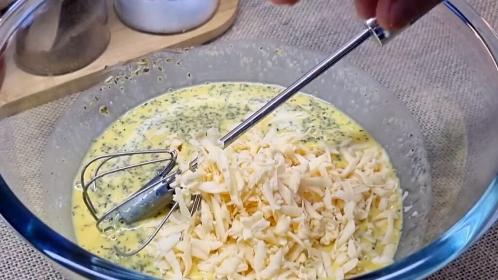 Przygotowanie mieszanki: W misce wymieszaj jajka, kwaśną śmietanę, sól, kolendrę, przyprawy prowansalskie, czarny pieprz, czerwoną paprykę, kurkumę i startą mozzarellę.