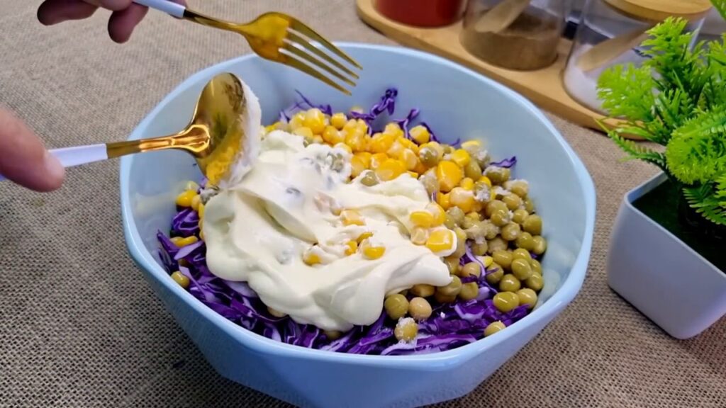 Przygotowanie sałatki: Przekrój pomidorki koktajlowe na pół, ogórki i czerwoną kapustę na mniejsze kawałki. Dodaj kukurydzę i groszek. Całość wymieszaj z majonezem, solą i pieprzem.