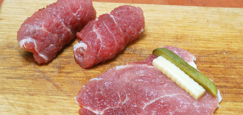 W tym czasie ogórki pokrój wzdłuż na 4 części, a ser w kilku centymetrowe słupki. Teraz posól mięso, a następnie ułóż na brzegach plastrów po jednej ćwiartce ogórka kiszonego i po kawałku sera.