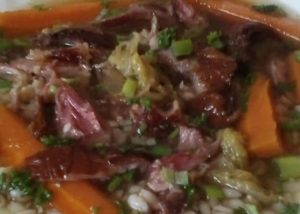 Przelej bulion z wędzonego mięsa przez sitko. Zeskrob mięso z żeber i włóż z powrotem do bulionu. Warzywa kroimy na mniejsze kawałki i również wrzucamy z powrotem do zupy. Namoczoną kaszę odcedzamy, gotujemy do miękkości i dodajemy do zupy. Pogotować jeszcze chwilę, doprawić solą, pieprzem i rozgniecionym czosnkiem i podawać.